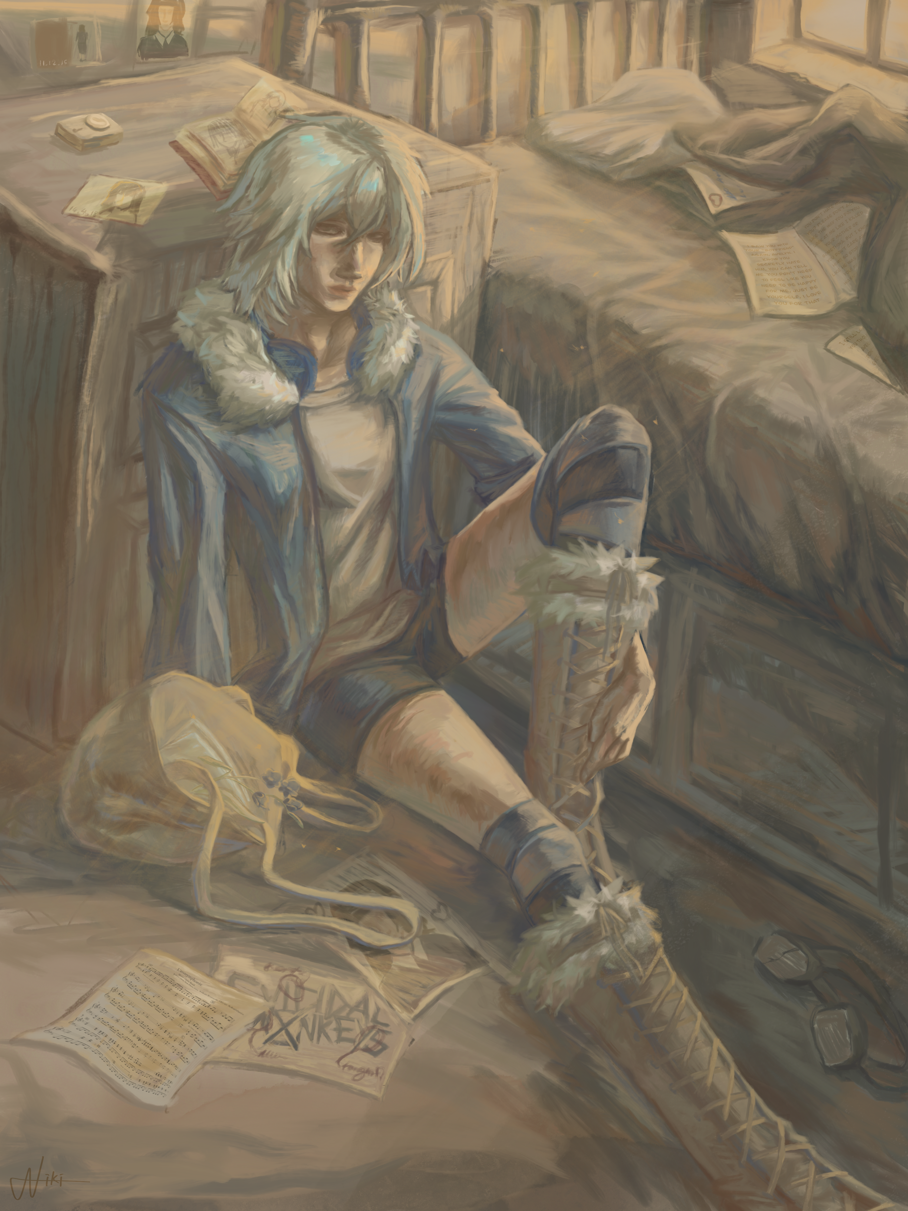 Her hair is silvery in a layered kind of haircut, a single ahoge sticks out and down from the top of her head. She wears her stripped stockings with shorts, a plain white shirt under a fur hood jacker that is dark navy blue. She has headphones with her often, her shoes are often fur boots.
