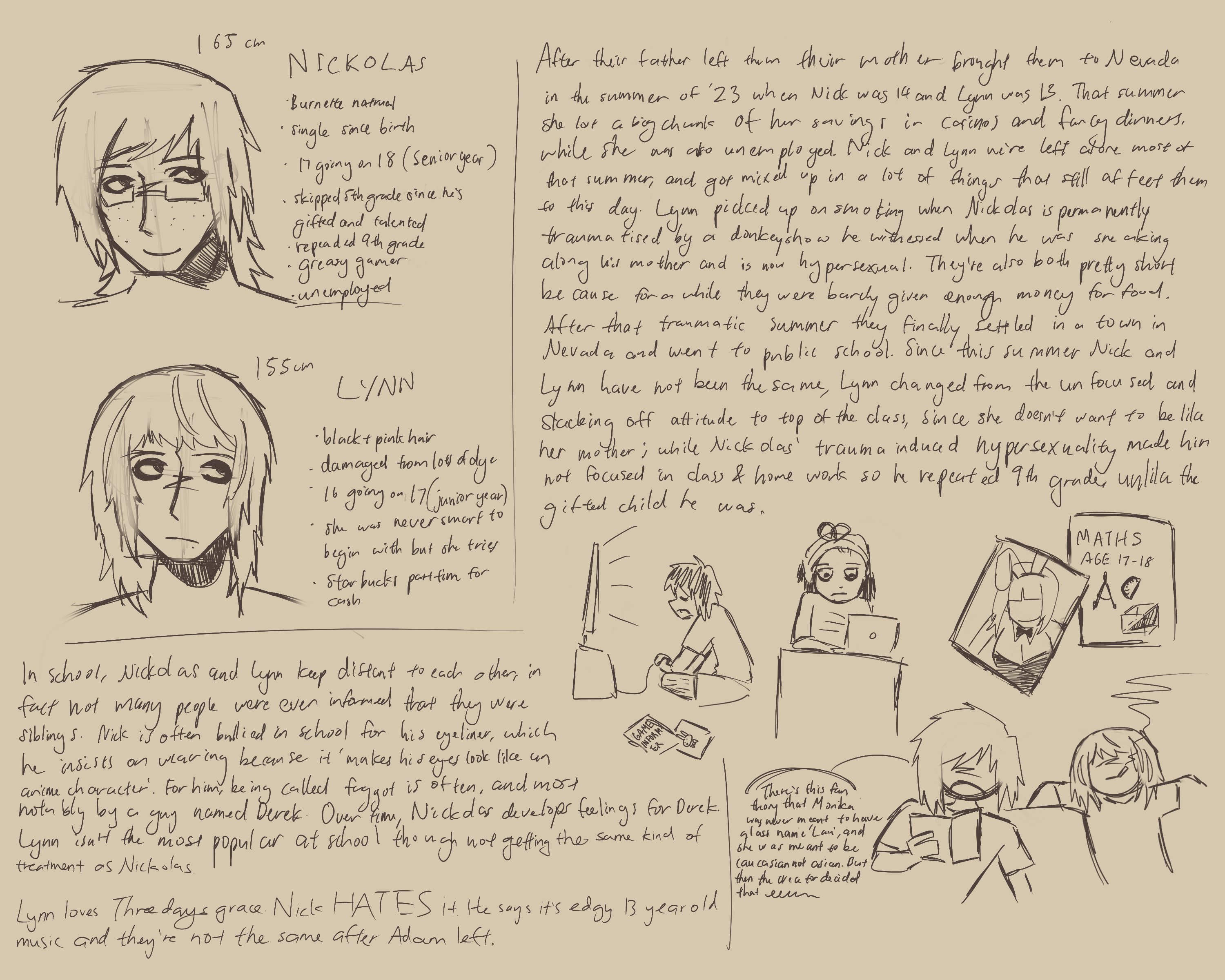 Nickolas is 17-18, senior year in high school. Lynn and him both go to the same school. As a child, he was smart and even skipped 5th grade due to his talent. His father left their family when he was in primary school, but if you ask him what happens he doesn't want to talk about it. In 2023 summer, when he was 14, his single mother brought the both of them to Nevada. She spent her days in the casinos, and left him and Lynn alone. He usually stayed in their dirty dingy apartment, his obsession with the internet and his phone and laptop grew. It is around this time where his eyes got really bad, because no one was really around to control his screen time. They weren't given much attention by their mother, and malnurishment plagued them that summr. This caused him to be very short for a 17 year old guy. But one day afternoon, he wanted to go see where his mother went every evening. So he snuck along with her out at night, following his mother who walked alongside men he didn't know. Nick made it in to the nightclub where her mother goes often, and is absolutely traumatised by the things he sees in there. His exposure to adult content as a 14 year old changed his brain chemistry greatly, leading him to become hypersexual. Soon he wasn't just a nerd on his crusty lenovo laptop, he was stealing playboy magazines from the club he kept sneaking back in to. When Nickolas and Lynn was sent to a public school in Nevada when the summer ended, he was not the smart gifted kid anymore, he couldn't be again after eveything changed for him. He redid 9th grade, but his mother really couldn't care less anymore. In high school, he is bullied for his height and makeup, he's called gay and a f*ggot by a guy named Derek. Derek doesn't know Nickolas likes him.